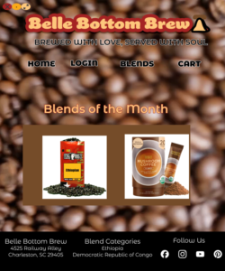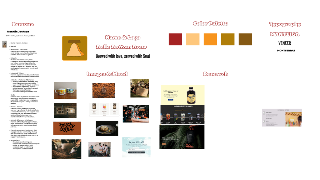 I created the branding. I made my font selection, color scheme, and logo based on a 1970s American color scheme because the target consumer is a retro leaning in lifestyle and fashion preferences. I created a customer persona based on market research of the average coffee consumer who is between 18 – 50.